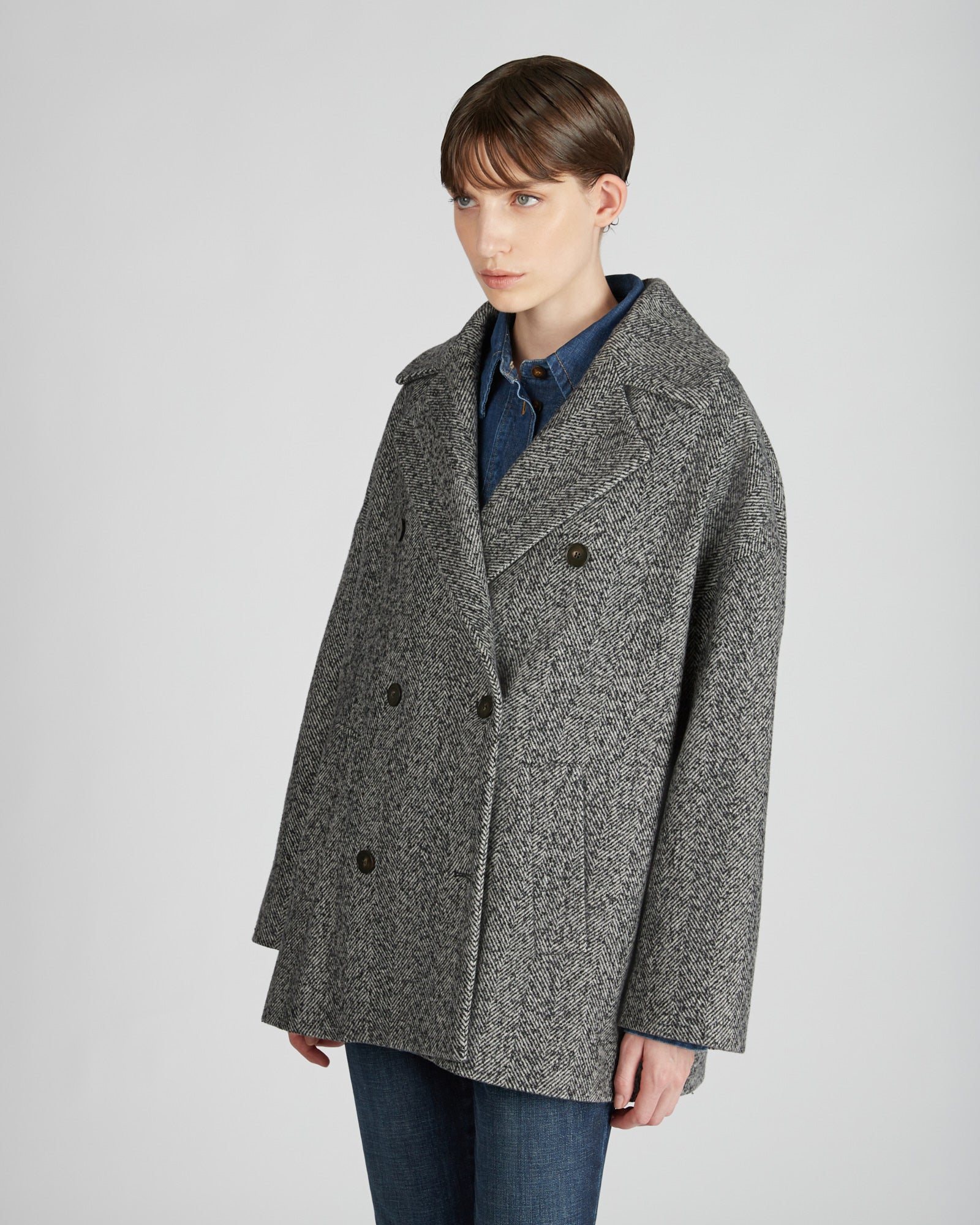 Inspired by the British Navy uniform and reinterpreted here in the volumes and details in a feminine way, the peacoat makes even the most casual look distinct and refined, thanks to its line and the unmistakable double-breasted closure. Here it is made of very soft and warm wool, produced through a certified process that guarantees the welfare of the animals and the safety of people and the environment at all stages of production. The herringbone weave adds further refinement to the garment, for timeless elegance.