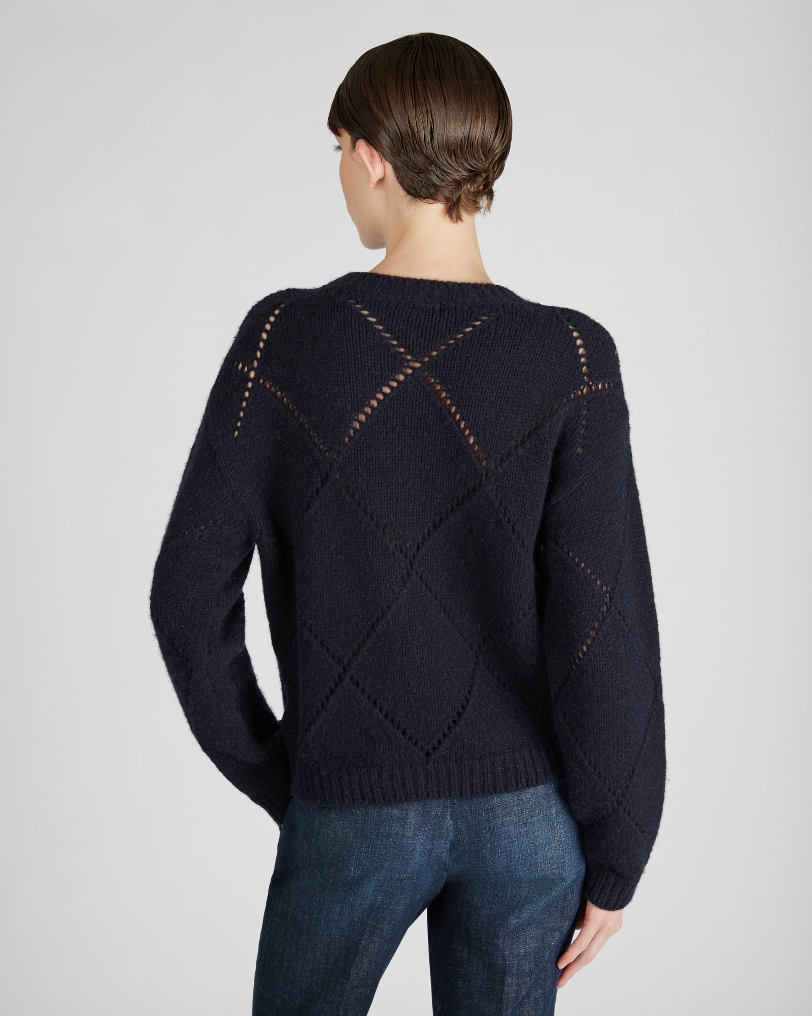 A luxury knitwear fibre, Alpaca wool is extremely durable, warm and soft. A fibre that can protect the wearer even in the coldest seasons, maintaining a certain lightness and ensuring a pleasant feeling thanks to its silky texture. Here it is used in combination with virgin wool on a wide-fit crewneck, embellished with a diamond pattern that increases the value and originality of the garment.
