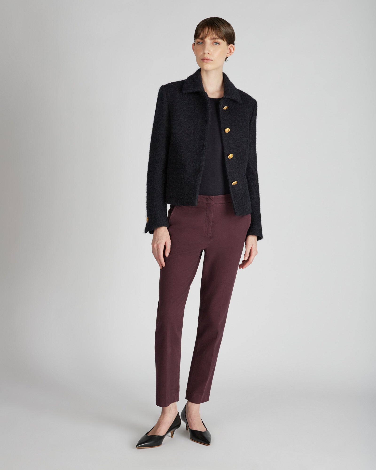 - The trousers have front slant pockets, rear double-welt pockets with buttons and narrow hems.